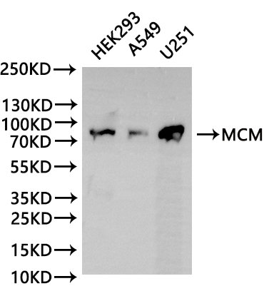 Positive WB detected in: HEK293 whole cell lysate(30μg), A549 whole cell lysate(30μg), U251 whole cell lysate(30μg)