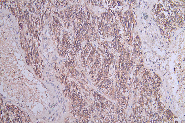IHC image of CSB-RA121182A0HU diluted at 1:100 and staining in paraffin-embedded human glioma cancer performed on a Leica BondTM system. After dewaxing and hydration, antigen retrieval was mediated by high pressure in a citrate buffer (pH 6.0). Section was blocked with 10% normal goat serum 30min at RT. Then primary antibody (1% BSA) was incubated at 4°C overnight. The primary is detected by a Goat anti-rabbit polymer IgG labeled by HRP and visualized using 0.05% DAB.