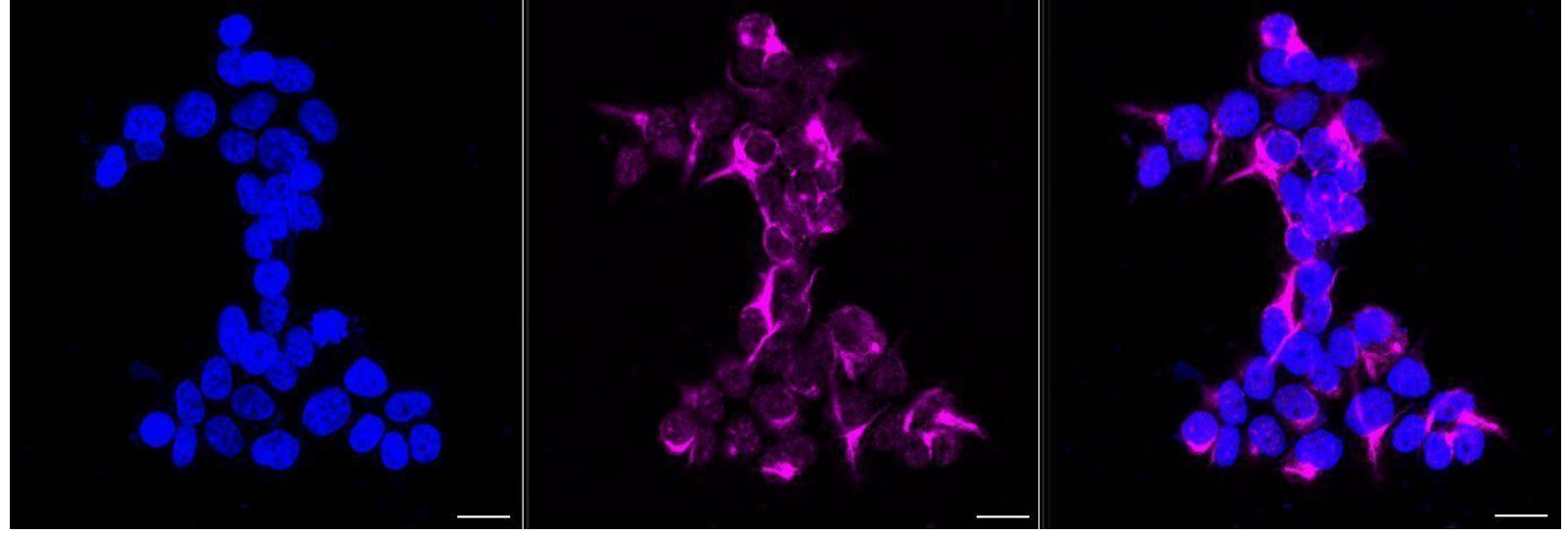 Immunocytochemical staining of Hela cells with Neurofilament medium chain antibody. Nuclei were stained blue with DAPI; Neurofilament medium chain was stained magenta with Alexa Fluor? 647. Images were taken using Leica stellaris 5. Protein abundance based on laser Intensity and smart gain: High. Scale bar, 20 μm.