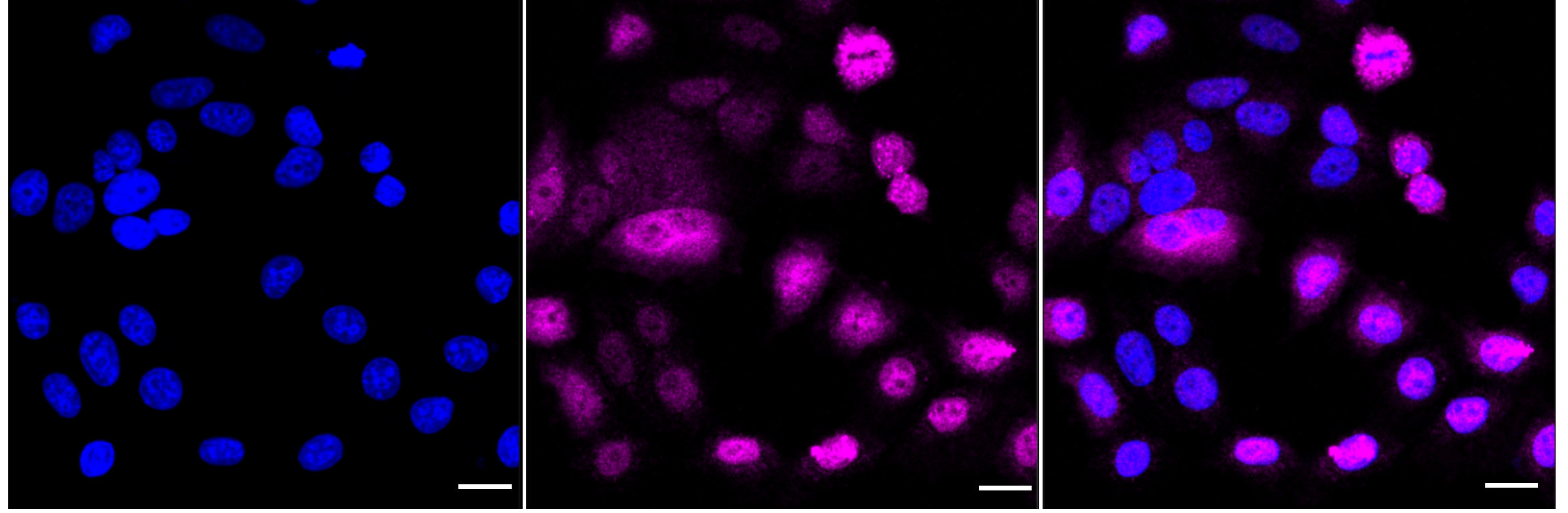 Immunocytochemical staining of HepG2 cells with Nuclear factor kappa B subunit 2 antibody. Nuclei were stained blue with DAPI; Nuclear factor kappa B subunit 2 was stained magenta with Alexa Fluor? 647. Images were taken using Leica stellaris 5. Protein abundance based on laser Intensity and smart gain: Medium. Scale bar: 20 μm.