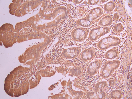 IHC image of CSB-RA187074A0HU diluted at 1:100 and staining in paraffin-embedded human small intestine tissue performed on a Leica BondTM system. After dewaxing and hydration, antigen retrieval was mediated by high pressure in a citrate buffer (pH 6.0). Section was blocked with 10% normal goat serum 30min at RT. Then primary antibody (1% BSA) was incubated at 4°C overnight. The primary is detected by a Goat anti-rabbit polymer IgG labeled by HRP and visualized using 0.05% DAB.