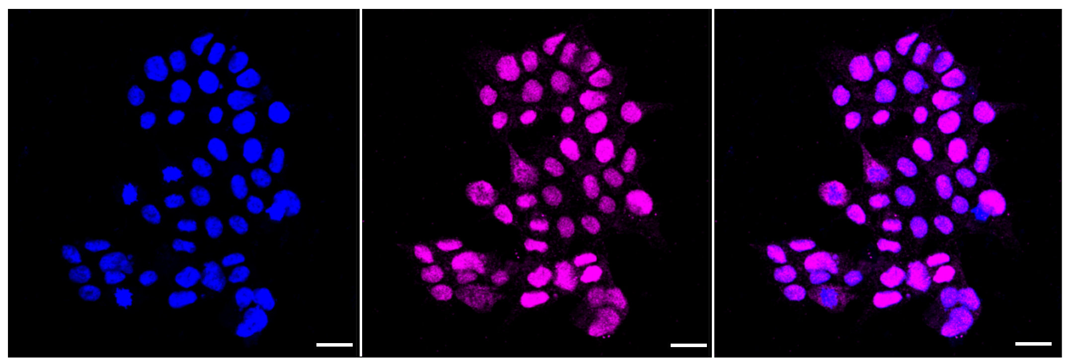 Immunocytochemical staining of HAP-1 cells with NK2 homeobox 1?antibody. Nuclei were stained blue with DAPI; NK2 homeobox 1?was stained magenta with Alexa Fluor? 647. Images were taken using Leica stellaris 5. Protein abundance based on laser Intensity and smart gain: Medium. Scale bar, 20 μm.
