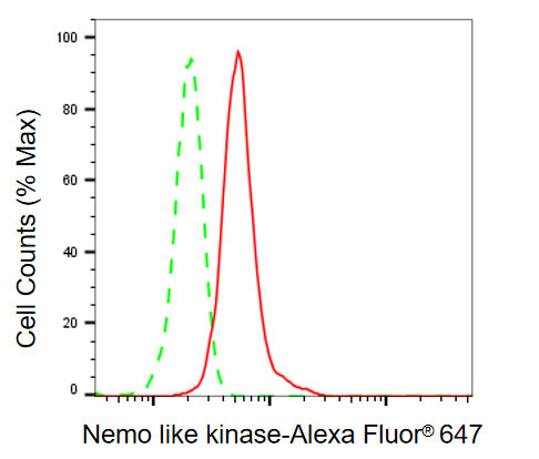 Flow cytometric analysis of nemo like kinase expression in HeLa cells using nemo like kinase antibody. Green, isotype control; red, nemo like kinase.
