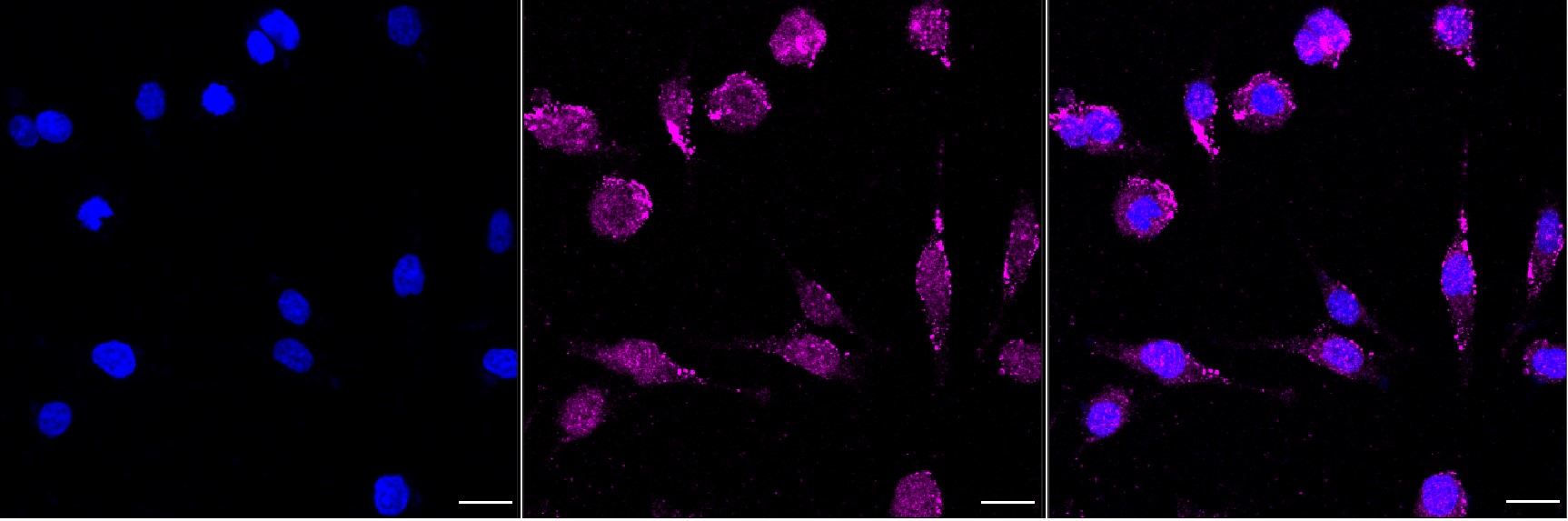 Immunocytochemical staining of HeLa cells with Nemo like kinase antibody. Nuclei were stained blue with DAPI; Nemo like kinase was stained magenta with Alexa Fluor? 647. Images were taken using Leica stellaris 5. Protein abundance based on laser Intensity and smart gain: Medium. Scale bar, 20 μm.