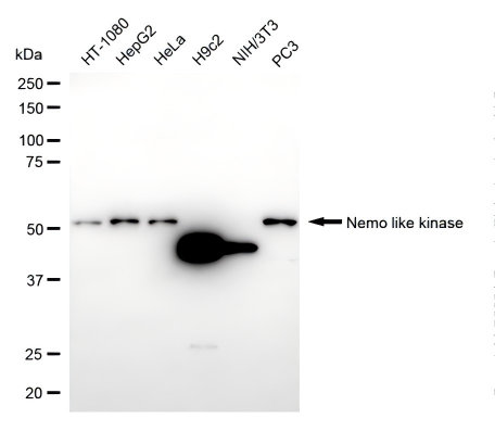 Western blotting analysis using nemo like kinase antibody. Total cell lysates (30 μg) from various cell lines were loaded and separated by SDS-PAGE. The blot was incubated with nemo like kinase antibody and HRP-conjugated goat anti-rabbit secondary antibody respectively.