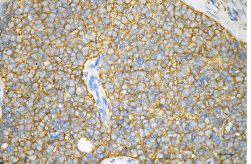 Immunohistochemistry was performed on paraffin-embedded human breast carcinoma using NME1 antibody. Antigen retrieval was done in sodium citrate buffer (pH 6.0). DAB was used for detection, with hematoxylin counterstaining. Images were acquired using a Nikon Ci-L Plus microscope (40× objective). Scale bar: 25 μm.
