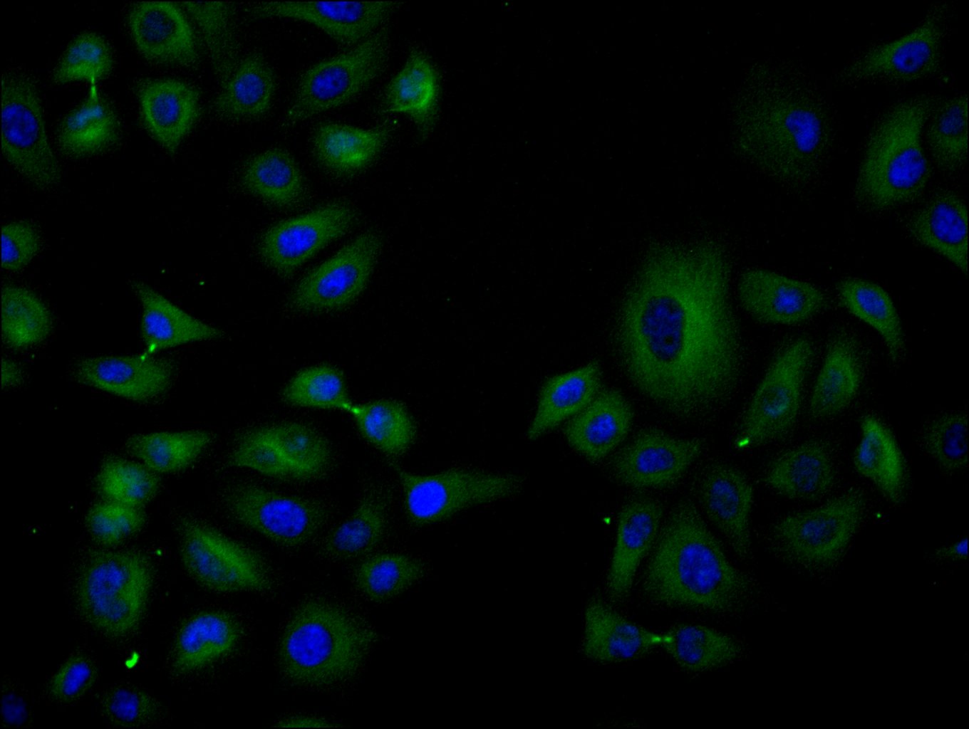 Immunofluorescence staining of Hela cell with CSB-RA580392A0HU at 1:50, counter-stained with DAPI. The cells were fixed in 4% formaldehyde, permeabilized using 0.2% Triton X-100 and blocked in 10% normal Goat Serum. The cells were then incubated with the antibody overnight at 4°C. The secondary antibody was Alexa Fluor 488-congugated AffiniPure Goat Anti-Rabbit IgG(H+L).