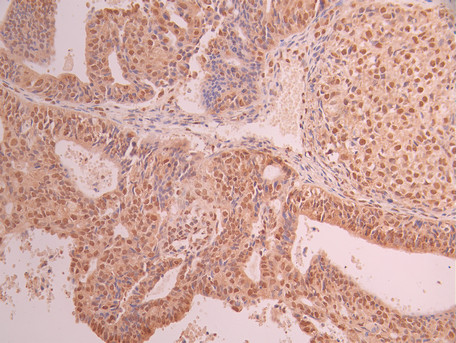 IHC image of CSB-RA948463A0HU diluted at 1:100 and staining in paraffin-embedded human ovarian cancer performed on a Leica BondTM system. After dewaxing and hydration, antigen retrieval was mediated by high pressure in a citrate buffer (pH 6.0). Section was blocked with 10% normal goat serum 30min at RT. Then primary antibody (1% BSA) was incubated at 4°C overnight. The primary is detected by a Goat anti-rabbit polymer IgG labeled by HRP and visualized using 0.05% DAB.