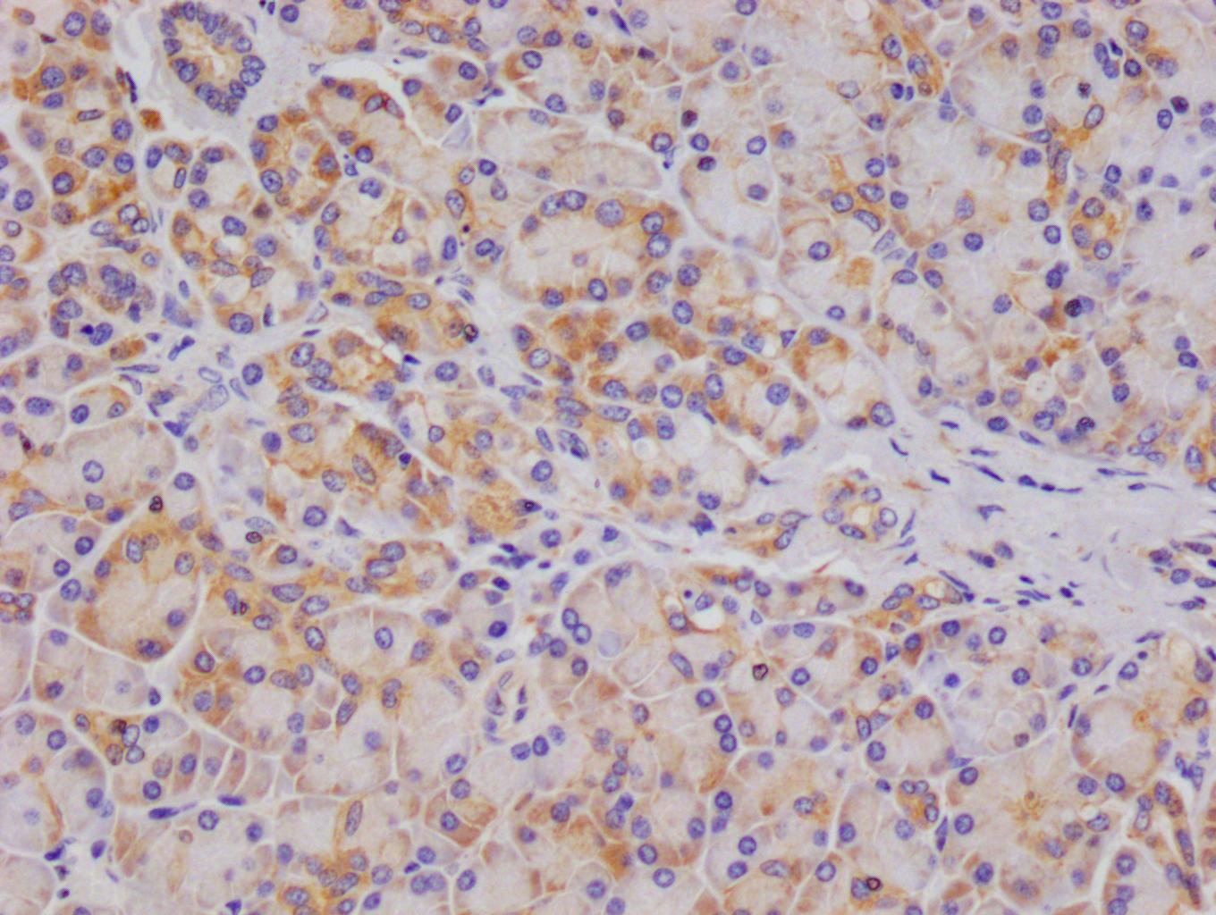 • IHC image of CSB-RA959292A0HU diluted at 1:100 and staining in paraffin-embedded human pancreatic tissue performed on a Leica BondTM system. After dewaxing and hydration, antigen retrieval was mediated by high pressure in a citrate buffer (pH 6.0). Section was blocked with 10% normal goat serum 30min at RT. Then primary antibody (1% BSA) was incubated at 4°C overnight. The primary is detected by a Goat anti-rabbit polymer IgG labeled by HRP and visualized using 0.05% DAB.