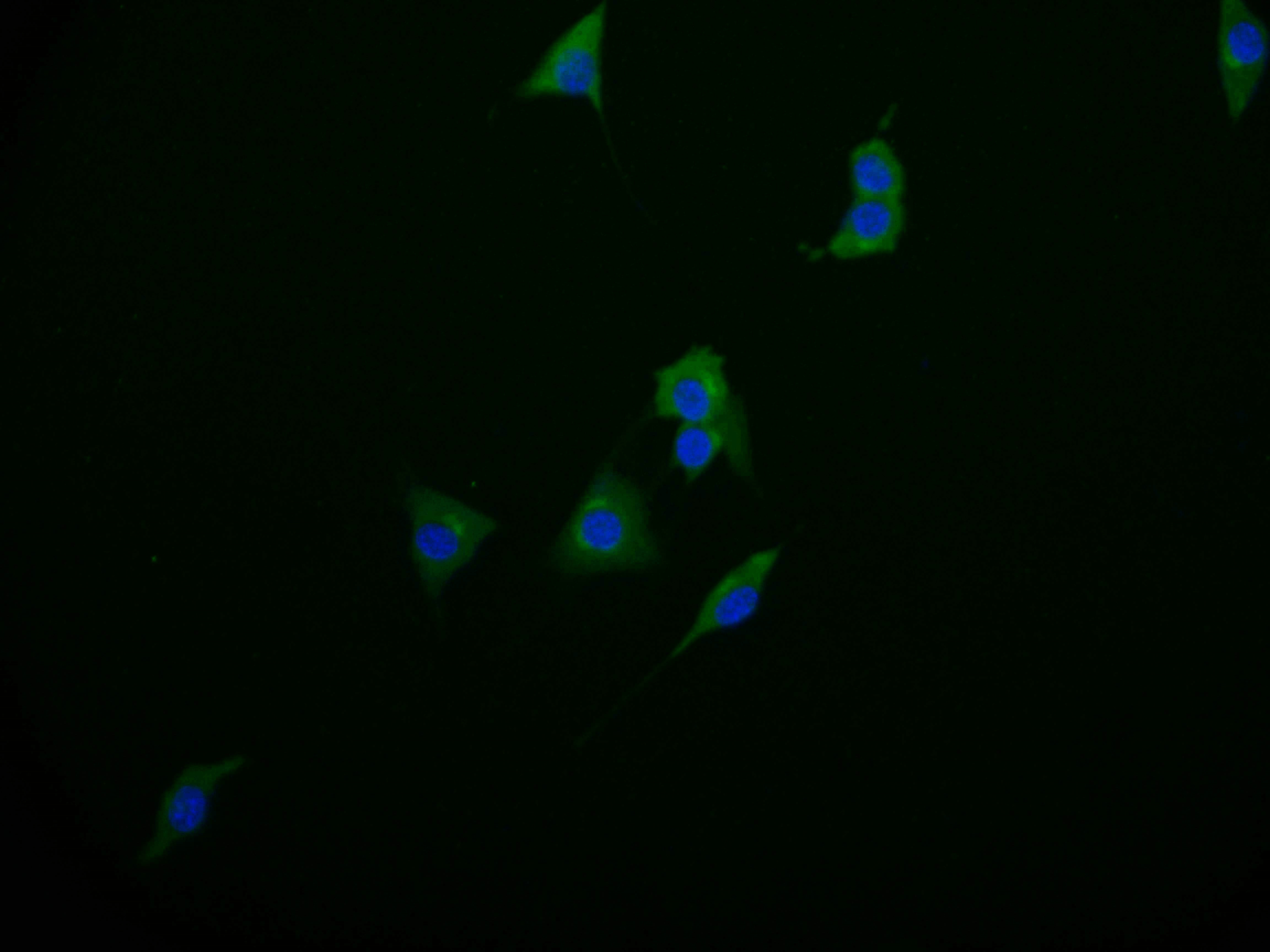 • Immunofluorescence staining of MCF-7 cell with CSB-RA169000A0HU at 1:50, counter-stained with DAPI. The cells were fixed in 4% formaldehyde and blocked in 10% normal Goat Serum. The cells were then incubated with the antibody overnight at 4°C. The secondary antibody was Alexa Fluor 598-congugated AffiniPure Goat Anti-Rabbit IgG(H+L).