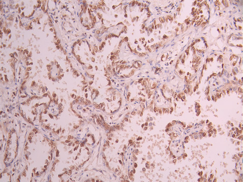 • IHC image of CSB-RA799971A0HU diluted at 1:100 and staining in paraffin-embedded human lung cancer performed on a Leica BondTM system. After dewaxing and hydration, antigen retrieval was mediated by high pressure in a citrate buffer (pH 6.0). Section was blocked with 10% normal goat serum 30min at RT. Then primary antibody (1% BSA) was incubated at 4°C overnight. The primary is detected by a Goat anti-rabbit polymer IgG labeled by HRP and visualized using 0.05% DAB.