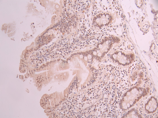 • IHC image of CSB-RA799971A0HU diluted at 1:100 and staining in paraffin-embedded human small intestine tissue performed on a Leica BondTM system. After dewaxing and hydration, antigen retrieval was mediated by high pressure in a citrate buffer (pH 6.0). Section was blocked with 10% normal goat serum 30min at RT. Then primary antibody (1% BSA) was incubated at 4°C overnight. The primary is detected by a Goat anti-rabbit polymer IgG labeled by HRP and visualized using 0.05% DAB.