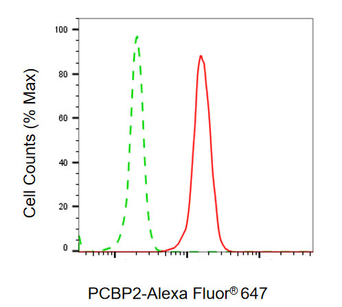 Flow cytometric analysis of PCBP2 expression in C2C12 cells using PCBP2 antibody. Green, isotype control; red, PCBP2.