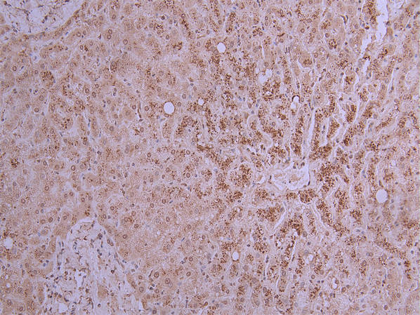 IHC image of CSB-RA017647MA1HU diluted at 1:200 and staining in paraffin-embedded human liver performed on a Leica BondTM system. After dewaxing and hydration, antigen retrieval was mediated by high pressure in a citrate buffer (pH 6.0). Section was blocked with 10% normal goat serum 30min at RT. Then primary antibody (1% BSA) was incubated at 4°C overnight. The primary is detected by a Goat anti-mouse polymer IgG labeled by HRP and visualized using 0.05% DAB.