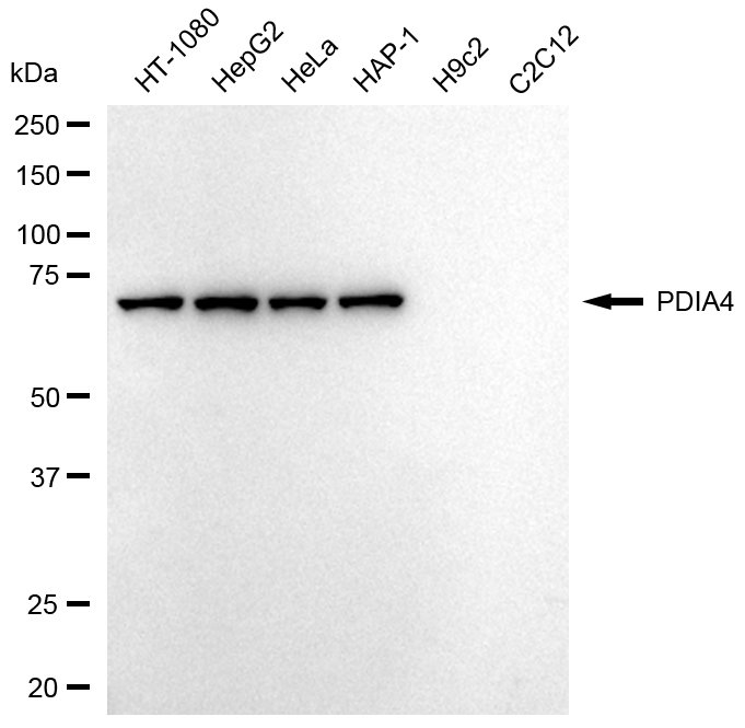 • Western blotting analysis using PDIA4 antibody. Total cell lysates (30 μg) from various cell lines were loaded and separated by SDS-PAGE. The blot was incubated with PDIA4 antibody and HRP-conjugated goat anti-rabbit secondary antibody respectively.