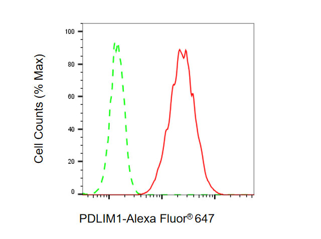 Flow cytometric analysis of PDLIM1 expression in H9c2 cells using PDLIM1 antibody. Green, isotype control; red, PDLIM1.