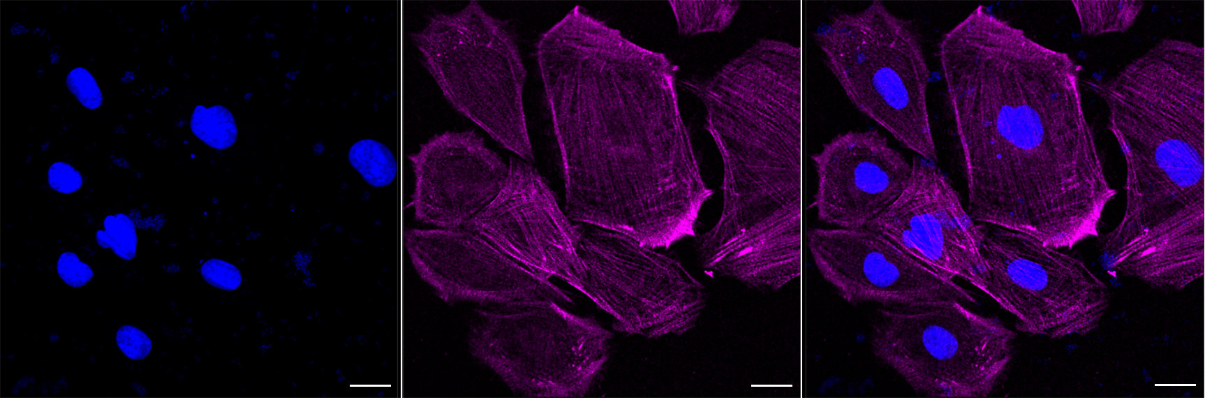 Immunocytochemical staining of H9c2 cells with PDLIM1 antibody. Nuclei were stained blue with DAPI; PDLIM1 was stained magenta with Alexa Fluor? 647. Images were taken using Leica stellaris 5. Protein abundance based on laser Intensity and smart gain: Medium. Scale bar, 20 μm.