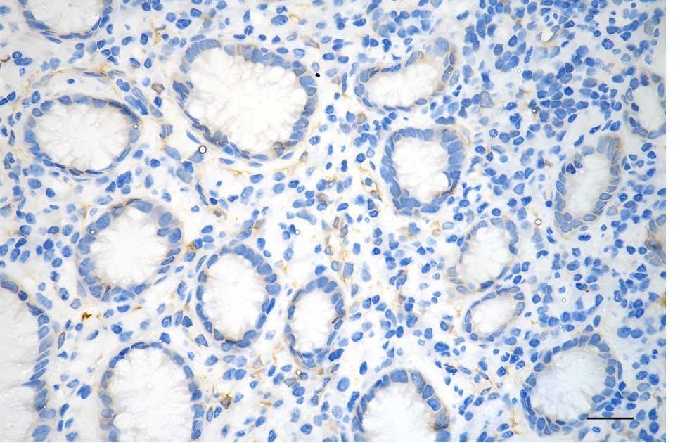 Immunohistochemistry was performed on paraffin-embedded human gastric carcinoma using PDLIM1 antibody. Antigen retrieval was done in sodium citrate buffer (pH 6.0). DAB was used for detection, with hematoxylin counterstaining. Images were acquired using a Nikon Ci-L Plus microscope (40× objective). Scale bar: 25 μm.