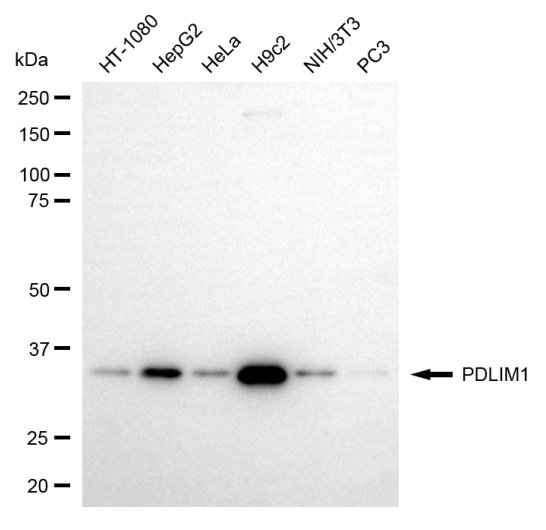 Western blotting analysis using PDLIM1 antibody. Total cell lysates (30 μg) from various cell lines were loaded and separated by SDS-PAGE. The blot was incubated with PDLIM1 antibody and HRP-conjugated goat anti-rabbit secondary antibody respectively.