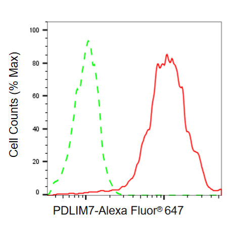 Flow cytometric analysis of PDLIM7 expression in HepG2 cells using PDLIM7 antibody. Green, isotype control; red, PDLIM7.