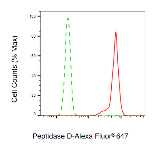 Flow cytometric analysis of Peptidase D expression in HT-1080 cells using Peptidase D antibody. Green, isotype control; red, Peptidase D.