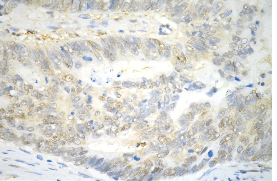 Immunohistochemistry was performed on paraffin-embedded human sigmoid colon carcinoma using peptidase D antibody. Antigen retrieval was done in sodium citrate buffer (pH 6.0). DAB was used for detection, with hematoxylin counterstaining. Images were acquired using a Nikon Ci-L Plus microscope (40× objective). Scale bar: 25 μm.
