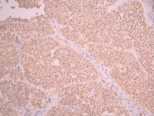 IHC image of CSB-RA188883A0HU diluted at 1:100 and staining in paraffin-embedded human liver cancer performed on a Leica BondTM system. After dewaxing and hydration, antigen retrieval was mediated by high pressure in a citrate buffer (pH 6.0). Section was blocked with 10% normal goat serum 30min at RT. Then primary antibody (1% BSA) was incubated at 4°C overnight. The primary is detected by a Goat anti-rabbit polymer IgG labeled by HRP and visualized using 0.05% DAB.