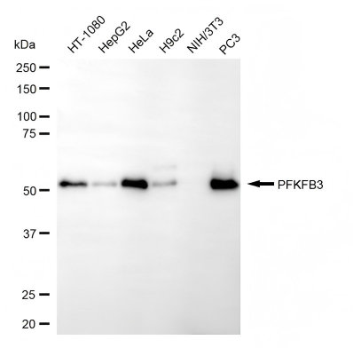 Western blotting analysis using PFKFB3 antibody. Total cell lysates (30 μg) from various cell lines were loaded and separated by SDS-PAGE. The blot was incubated with PFKFB3 antibody and HRP-conjugated goat anti-rabbit secondary antibody respectively.