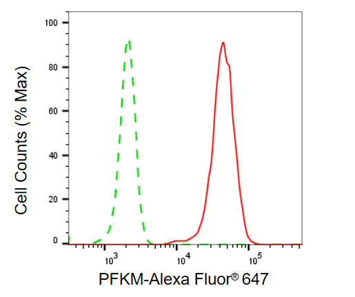 • Flow cytometric analysis of PFKM expression in HepG2 cells using PFKM antibody. Green, isotype control; red, PFKM.