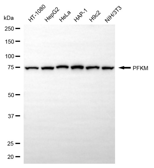 • Western blotting analysis using PFKM antibody. Total cell lysates (30 μg) from various cell lines were loaded and separated by SDS-PAGE. The blot was incubated with PFKM antibody and HRP-conjugated goat anti-rabbit secondary antibody respectively.