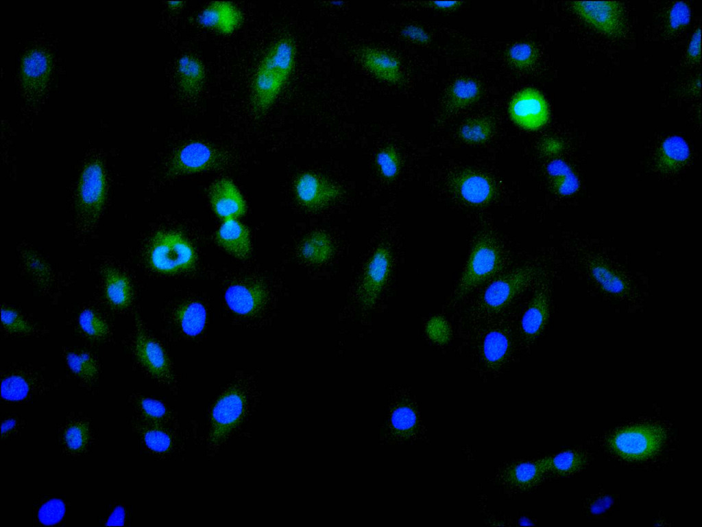 Immunofluorescence staining of A549 cell with CSB-RA106449A0HU at 1:50, counter-stained with DAPI. The cells were fixed in 4% formaldehyde, permeabilized using 0.2% Triton X-100 and blocked in 10% normal Goat Serum. The cells were then incubated with the antibody overnight at 4°C. The secondary antibody was Alexa Fluor 488-congugated AffiniPure Goat Anti-Rabbit IgG(H+L).