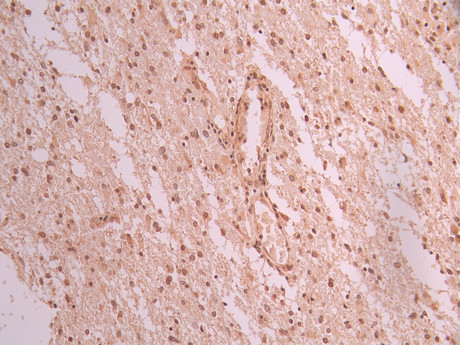 IHC image of CSB-RA106449A0HU diluted at 1:100 and staining in paraffin-embedded human glioma cancer performed on a Leica BondTM system. After dewaxing and hydration, antigen retrieval was mediated by high pressure in a citrate buffer (pH 6.0). Section was blocked with 10% normal goat serum 30min at RT. Then primary antibody (1% BSA) was incubated at 4°C overnight. The primary is detected by a Goat anti-rabbit polymer IgG labeled by HRP and visualized using 0.05% DAB.