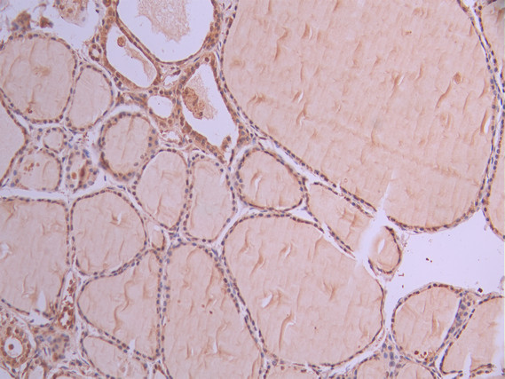 IHC image of CSB-RA106449A0HU diluted at 1:100 and staining in paraffin-embedded human thyroid tissue performed on a Leica BondTM system. After dewaxing and hydration, antigen retrieval was mediated by high pressure in a citrate buffer (pH 6.0). Section was blocked with 10% normal goat serum 30min at RT. Then primary antibody (1% BSA) was incubated at 4°C overnight. The primary is detected by a Goat anti-rabbit polymer IgG labeled by HRP and visualized using 0.05% DAB.