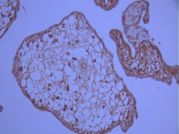 IHC image of CSB-RA177398A0HU diluted at 1:100 and staining in paraffin-embedded human placenta tissue performed on a Leica BondTM system. After dewaxing and hydration, antigen retrieval was mediated by high pressure in a citrate buffer (pH 6.0). Section was blocked with 10% normal goat serum 30min at RT. Then primary antibody (1% BSA) was incubated at 4°C overnight. The primary is detected by a Goat anti-rabbit polymer IgG labeled by HRP and visualized using 0.05% DAB.