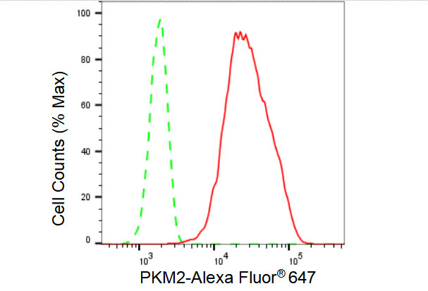 Flow cytometric analysis of PKM2 expression in HT-1080 cells using PKM2 antibody. Green, isotype control; red, PKM2.