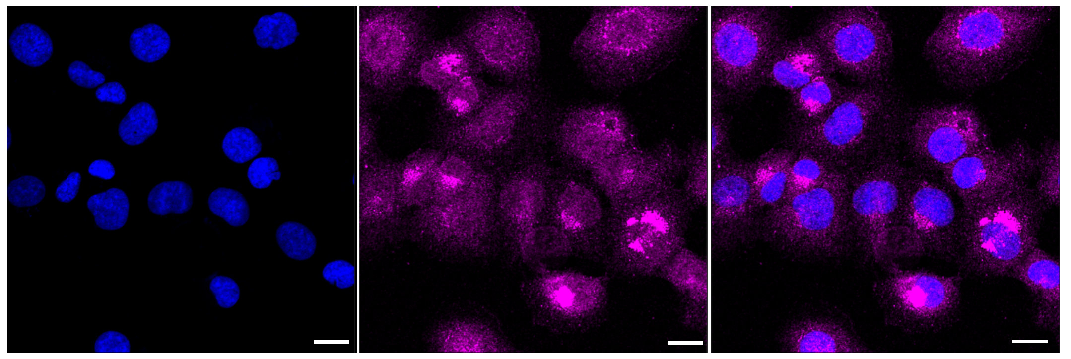 Immunocytochemical staining of HT-1080 cells with PKM2 antibody. Nuclei were stained blue with DAPI; PKM2 was stained magenta with Alexa Fluor? 647. Images were taken using Leica stellaris 5. Protein abundance based on laser Intensity and smart gain: Medium. Scale bar: 20 μm.