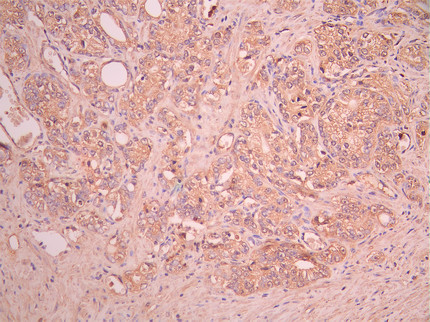 IHC image of CSB-RA360437MA1HU diluted at 1:50 and staining in paraffin-embedded human prostate cancer performed on a Leica BondTM system. After dewaxing and hydration, antigen retrieval was mediated by high pressure in a citrate buffer (pH 6.0). Section was blocked with 10% normal goat serum 30min at RT. Then primary antibody (1% BSA) was incubated at 4°C overnight. The primary is detected by a Anti-Human lgG, Fcy Fragment Specific labeled by HRP and visualized using 0.05% DAB.