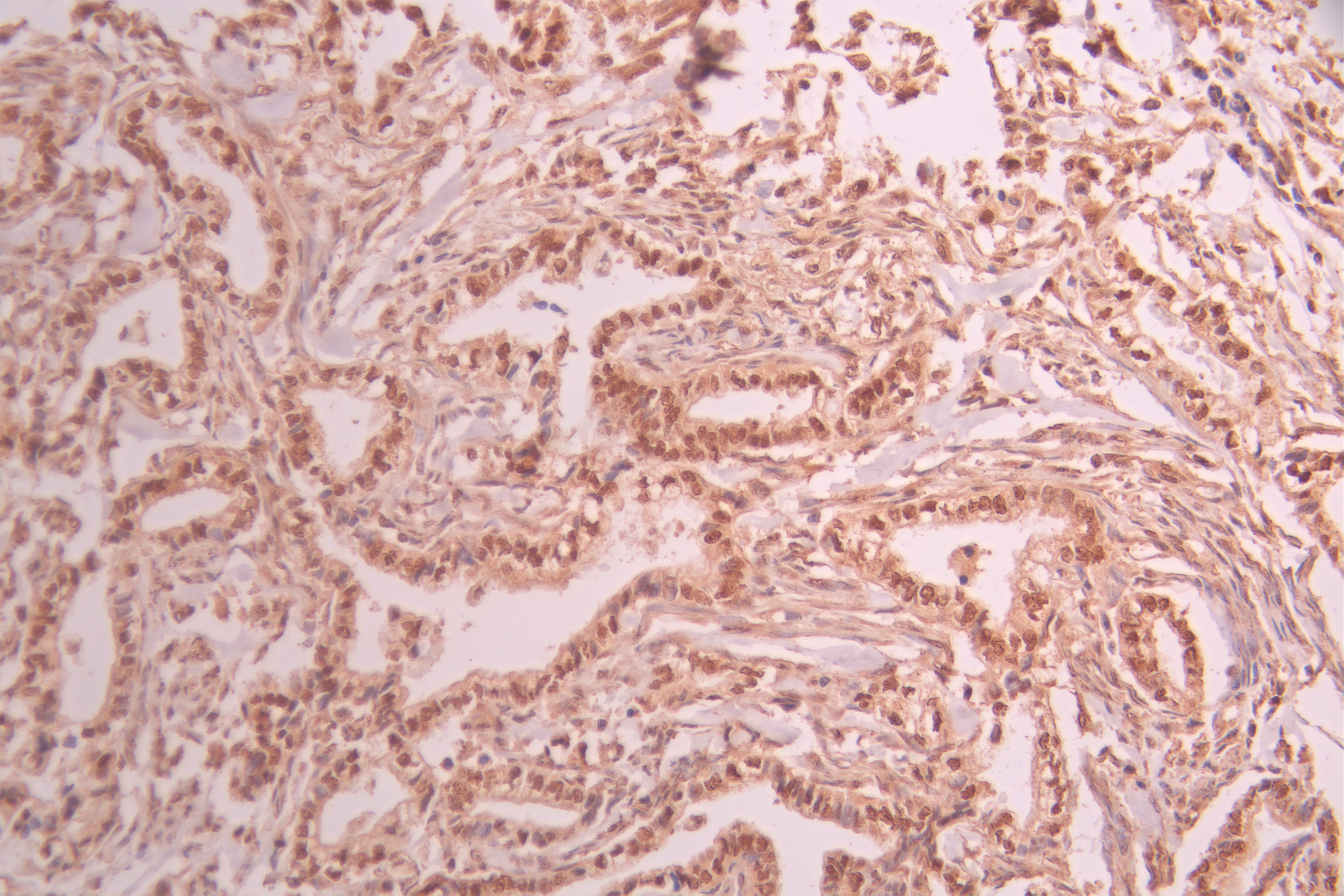 Immunofluorescence staining of A-549 cell with CSB-RA171352A0HU at 1:50, counter-stained with DAPI. The cells were fixed in 4% formaldehyde, permeabilized using 0.2% Triton X-100 and blocked in 10% normal Goat Serum. The cells were then incubated with the antibody overnight at 4°C. The secondary antibody was Alexa Fluor 488-congugated AffiniPure Goat Anti-Rabbit IgG(H+L).