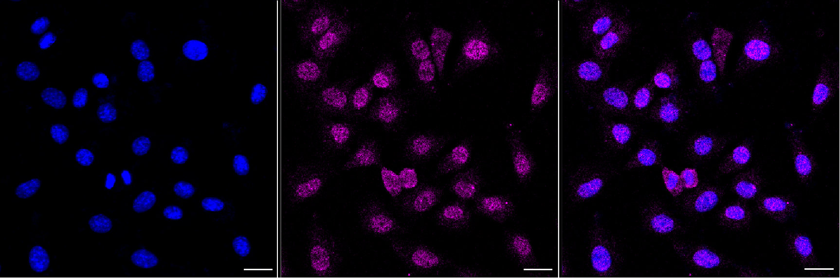 • Immunocytochemical staining of C2C12 cells with DNA polymerase beta antibody. Nuclei were stained blue with DAPI; DNA polymerase beta was stained magenta with Alexa Fluor? 647. Images were taken using Leica stellaris 5. Protein abundance based on laser Intensity and Smart Gain: Low. Scale bar, 20 μm.