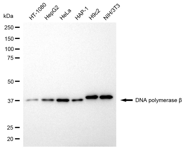 • Western blotting analysis using DNA polymerase beta antibody. Total cell lysates (30 μg) from various cell lines were loaded and separated by SDS-PAGE. The blot was incubated with DNA polymerase beta antibody and HRP-conjugated goat anti-rabbit secondary antibody respectively.