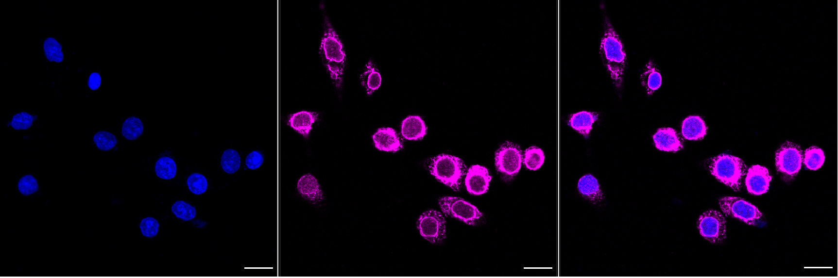 Immunocytochemical staining of HepG2 cells with Paraoxonase 2 antibody. Nuclei were stained blue with DAPI; Paraoxonase 2 was stained magenta with Alexa Fluor? 647. Images were taken using Leica stellaris 5. Protein abundance based on laser Intensity and smart gain: High. Scale bar, 20 μm.