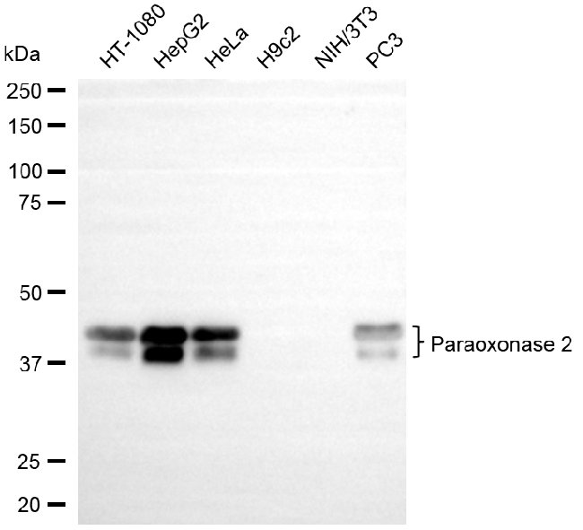 Western blotting analysis using paraoxonase 2 antibody. Total cell lysates (30 μg) from various cell lines were loaded and separated by SDS-PAGE. The blot was incubated with paraoxonase 2 antibody and HRP-conjugated goat anti-rabbit secondary antibody respectively.