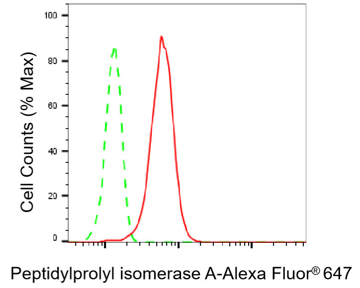 Flow cytometric analysis of Peptidylprolyl isomerase A expression in HepG2 cells using Peptidylprolyl isomerase A antibody. Green, isotype control; red, Peptidylprolyl isomerase A.