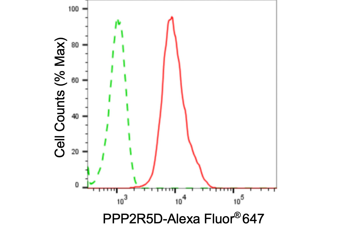 • Flow cytometric analysis of PPP2R5D expression in HepG2 cells using PPP2R5D antibody. Green, isotype control; red, PPP2R5D.