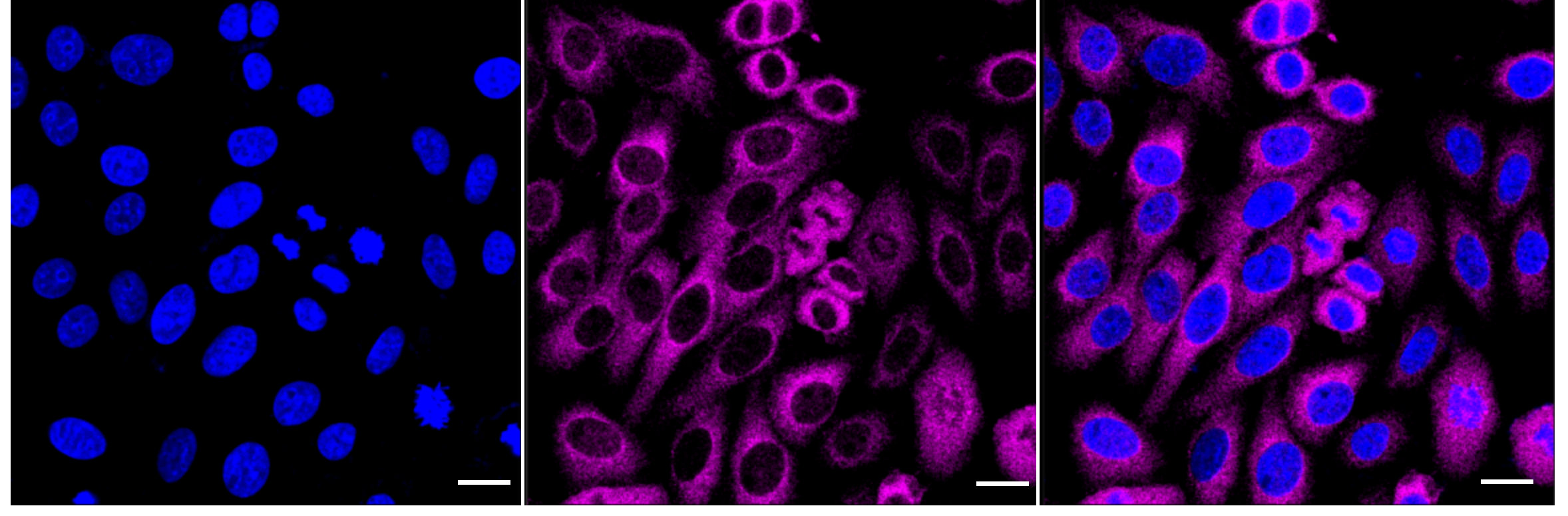 • Immunocytochemical staining of HepG2 cells with PPP2R5D antibody. Nuclei were stained blue with DAPI; PPP2R5D was stained magenta with Alexa Fluor? 647. Images were taken using Leica stellaris 5. Protein abundance based on laser Intensity and smart gain: Medium. Scale bar: 20 μm.