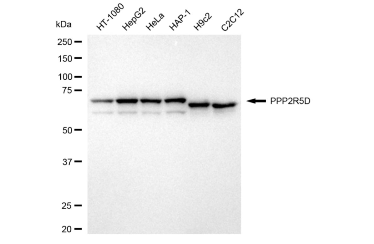 • Western blotting analysis using PPP2R5D? antibody. Total cell lysates (30 μg) from various cell lines were loaded and separated by SDS-PAGE. The blot was incubated with PPP2R5D antibody and HRP-conjugated goat anti-rabbit secondary antibody respectively.