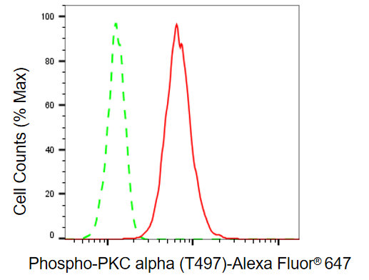 Flow cytometric analysis of Phospho-PKC alpha (T497) expression in C2C12 cells using Phospho-PKC alpha (T497) antibody. Green, isotype control; red, Phospho-PKC alpha (T497).