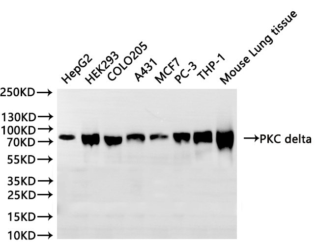 Positive WB detected in: HepG2 whole cell lysate(30μg), HEK293 whole cell lysate(30μg), COLO205 whole cell lysate(30μg), A431 whole cell lysate(30μg), MCF7 whole cell lysate(30μg), PC-3 whole cell lysate(30μg), THP-1 whole cell lysate(30μg), Mouse lung tissue lysate(30μg)