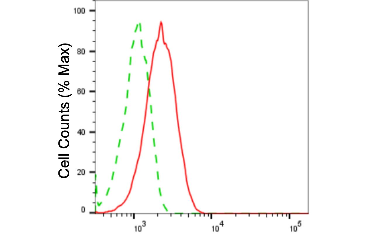 • Flow cytometric analysis of CD133 expression in HAP-1 cells using CD133 antibody. Green, isotype control; red, CD133.