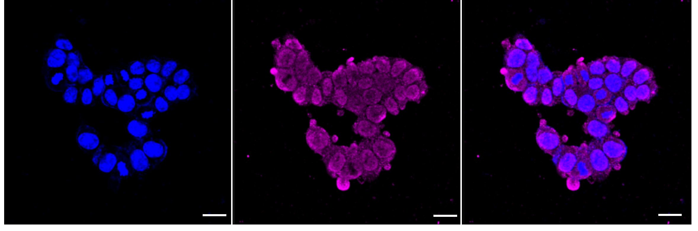 • Immunocytochemical staining of HAP-1 cells with CD133 antibody. Nuclei were stained blue with DAPI; CD133 was stained magenta with Alexa Fluor? 647. Images were taken using Leica stellaris 5. Protein abundance based on laser Intensity and smart gain: Medium. Scale bar: 20 μm.